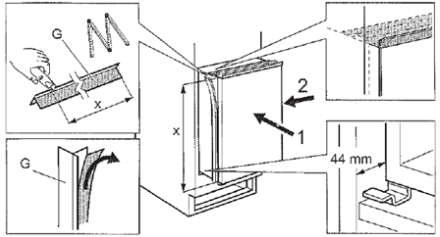 -Opstilling i skab med glidehængsler (Køkkenlåge monteret i glideskinne på fryserdør)