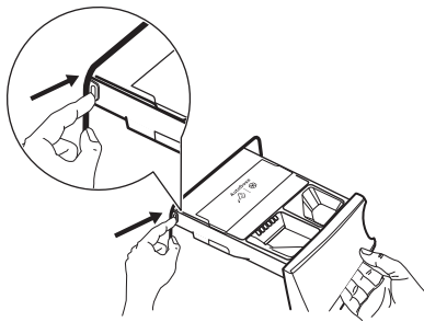- Åbn vaskemiddelskuffen. Tryk på hagen som angivet på billedet, og træk vaskemiddelbeholderen ud.