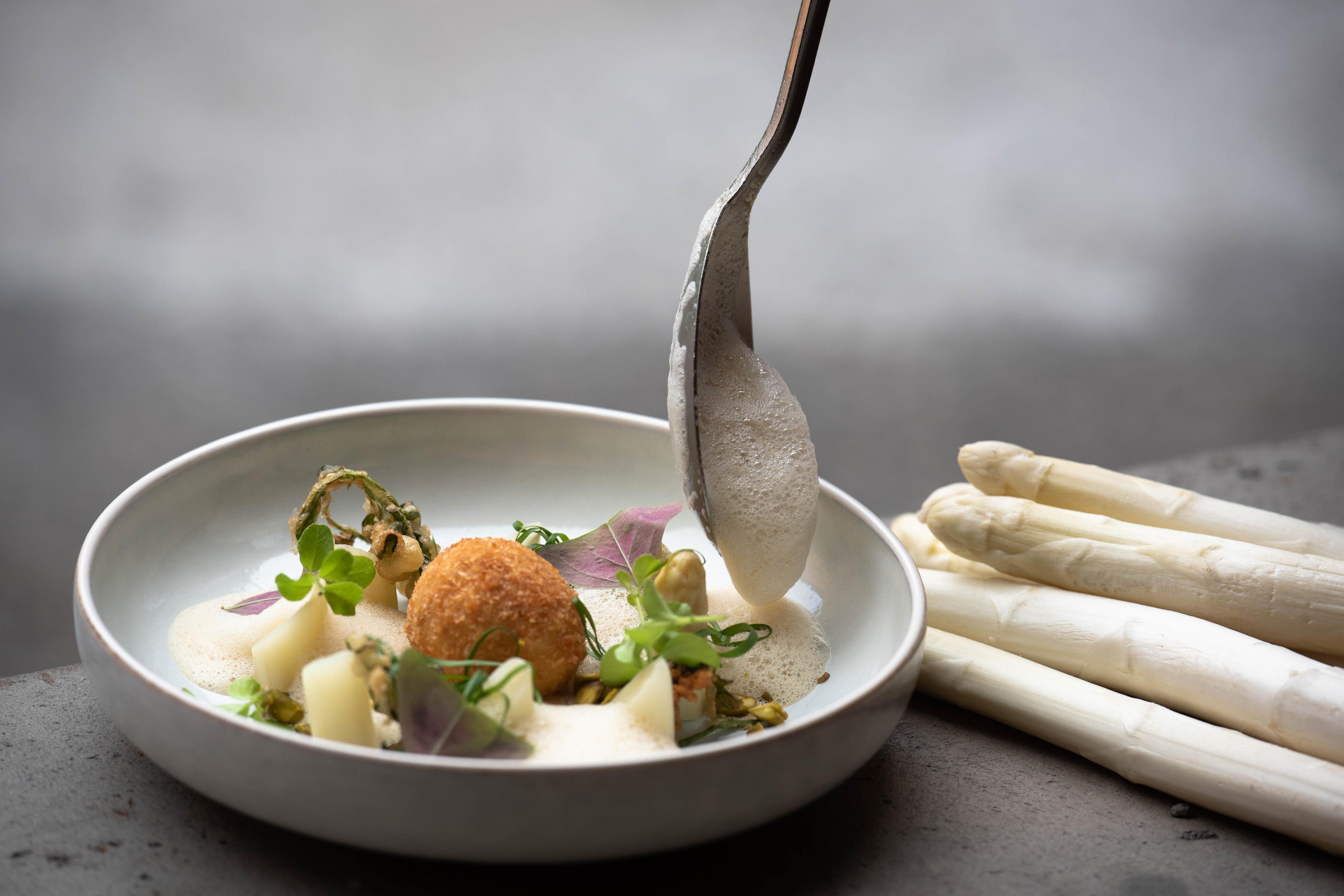 Hvide asparges med citrongræs, sprødt æg, smurt aspargesbouillon og pistacienødder