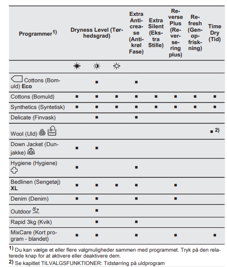 Billede: Eksempel på programtabel til vaskemaskiner