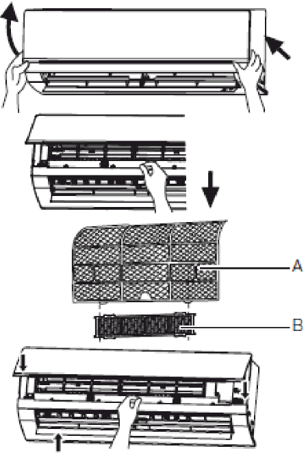 Installation: 1. Fjern frontpanelet. 2. Fjern luftfilter (A). 3. Fastgør sundhedsfilter (B) til luftfilter (A). 4. Installer luftfilter (A). 5. Fjern frontpanelet. Rengøring og vedligeholdelse: 1. Fjern filteret. 2. Fjern støv fra sundhedsfilteret ved hjælp af en støvsuger. 3. Hvis sundhedsfilteret er beskidt, skal du rengøre det med varmt vand og et mildt rengøringsmiddel. Lad sundhedsfilteret tørre naturligt på et køligt, mørkt sted. 4. Installer sundhedsfilteret. Serviceinterval: 1. Serviceintervallet for sundhedsfiltre er ca. et år under normale forhold. Sundhedsfiltre skal udskiftes, når overfladen bliver sort (grøn). |