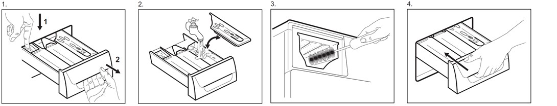 Der kan fra tid til anden dannes mug og skimmel omkring sæbeskuffen, som kan afgive lugt.Rens evt. spild eller rester i hvert rum ved at, vaske skuffen i lunt vand fra hanen. Tag skuffen ud og brug en egnet børste til at rense snavs og indtørret sæbe/væske væk fra de enkelte rum i skuffen (en gammel tandbørste kan gøre underværker)