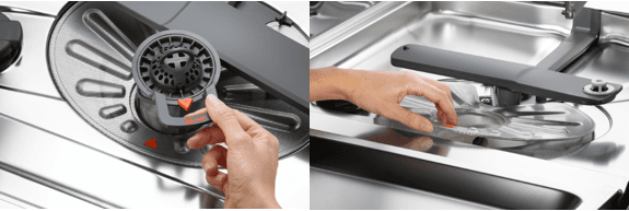 - Prøv at rengøre opvaskemaskinens filtre (også det store filter rundt om filter i midten) og sørg for, at der ikke er madrester eller snavs i eller omkring bundkarrets kant. Prøv derefter maskinen igen.