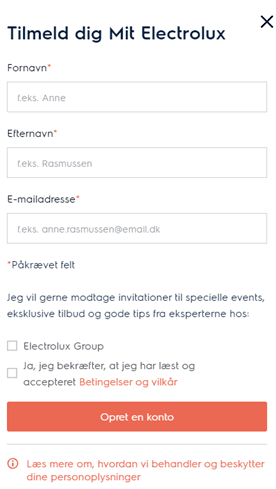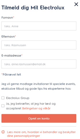 Her trykker du på “Tilmeld dig Mit Electrolux" og vil blive ført videre til næste side