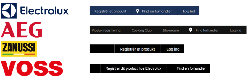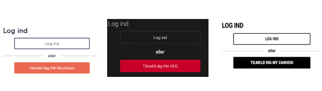 - Kig mod øverste højre hjørne på siden og klik på “Log ind” / “Registrer dit produkt hos Electrolux”. Det ser således ud på de fire hjemmesider: