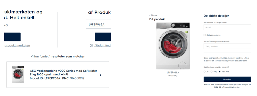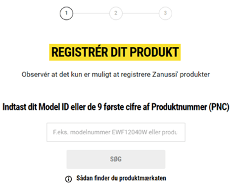- Indtast dit produktnummer (se side x) og tryk søg.